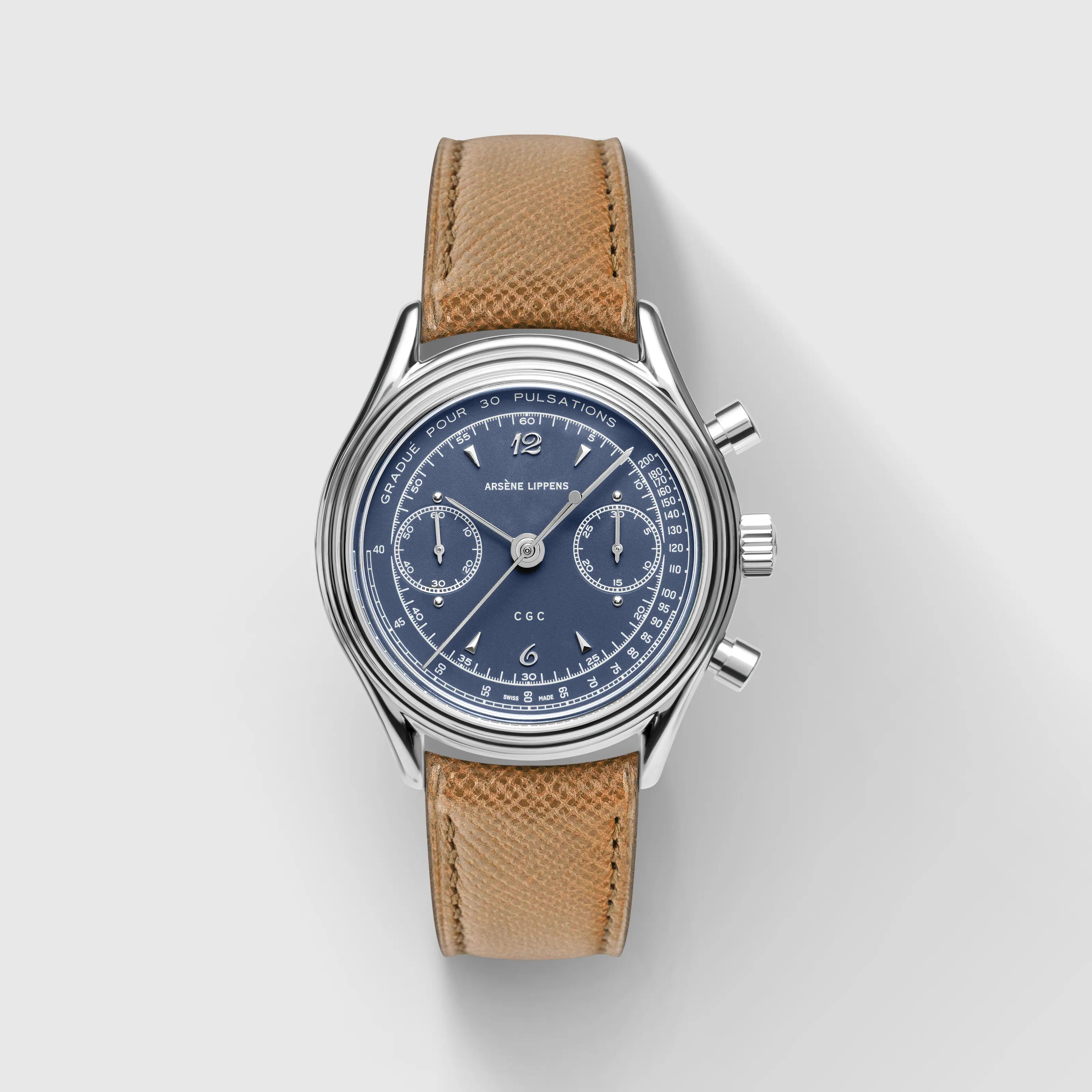 Crafted exclusively for a private group of vintage watch collectors in Hong Kong, this edition features a matte blue dial with the CollectorsGuideclub logo at 6 o’clock, silver hands, and a cognac Saffiano strap paired with a deployant clasp.