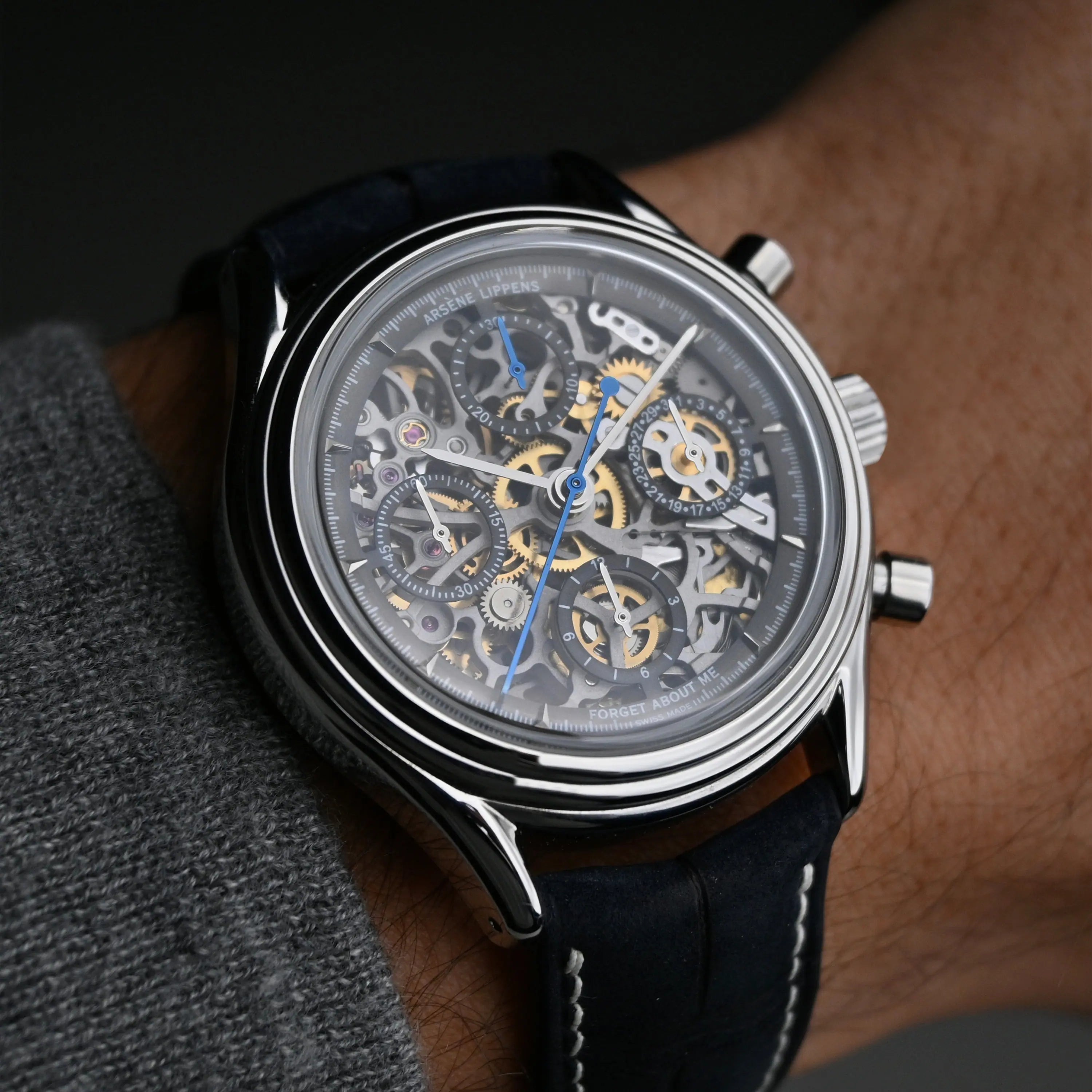 The custom AL rotor is crafted with micro-blasting, bevelling, circular brushing, rhodium plating, and hidden perlage. Every element reflects Arsène Lippens’ commitment to precision and finishing at the highest level.