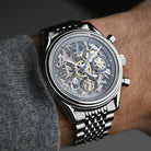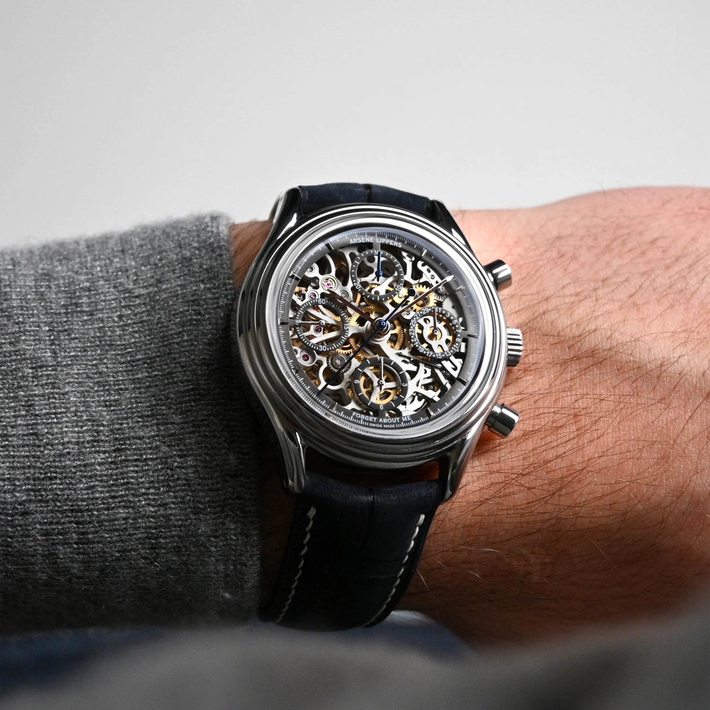 The skeletonized Valjoux 7750 movement is finished without plating, highlighting its micro-blasted bridges and gold-plated wheels with a brushed finish. A raw and honest approach that celebrates the mechanics within.